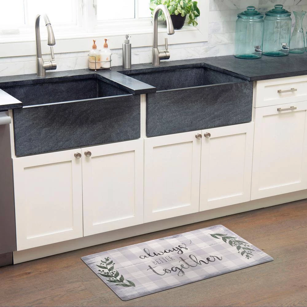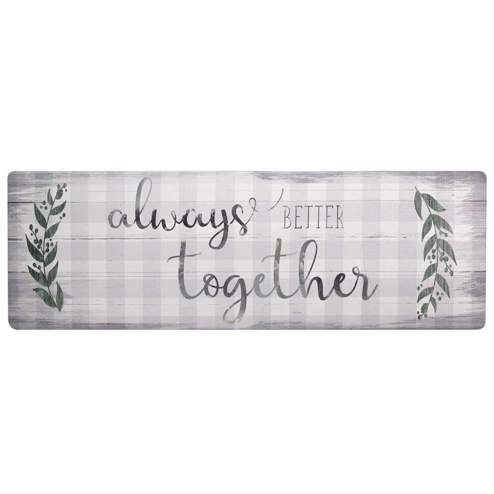 Bring coziness and style to your kitchen decor with the Cozy Living Always Better Together kitchen mat by SoHome. Featuring a family friendly word saying on a distressed buffalo check background that is perfect for your farmhouse decor. This anti-fatigue mat will provide long-lasting comfort while you perform your tasks. Finished with a beautifully embossed textured top, these mats are constructed of durable polyvinyl with a smooth beveled edge that provides a safe and secure, anti-slip surface.