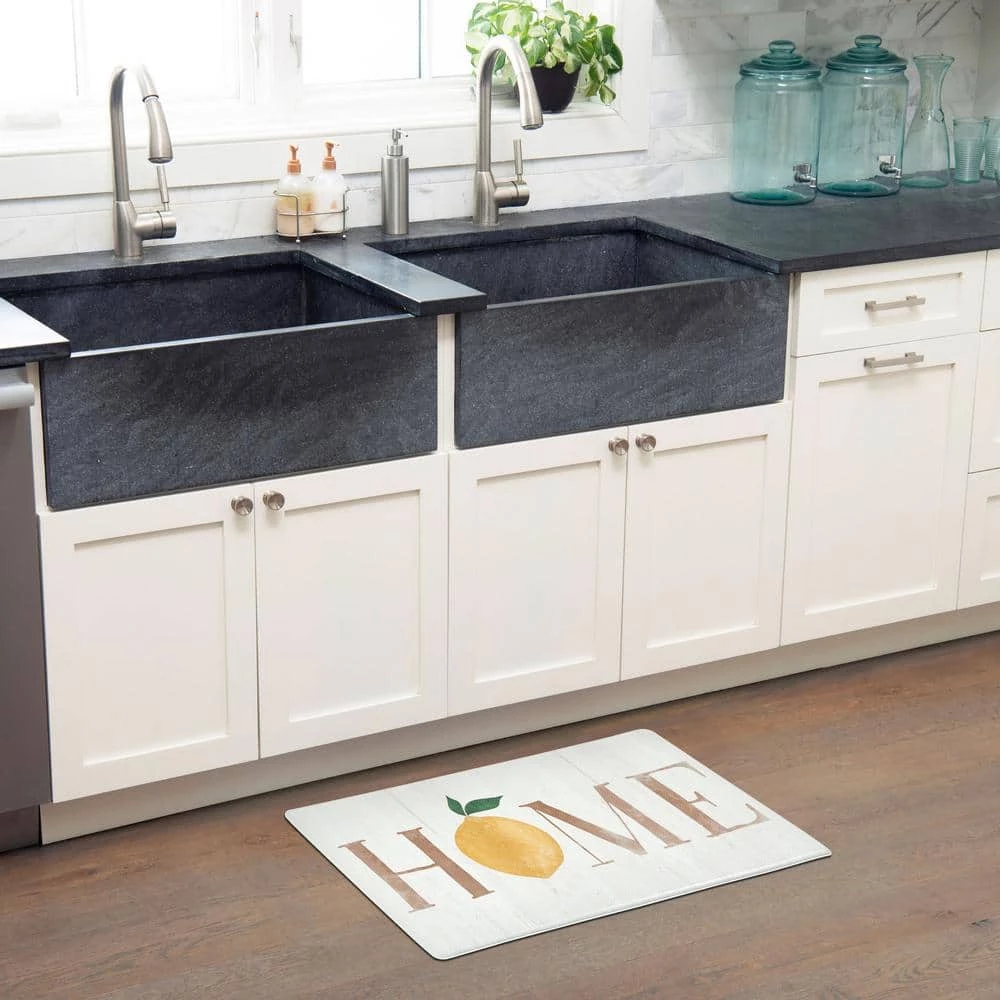 Add sweetness to your decor with the Cozy Living Home Lemon kitchen mat by SoHome. Featuring a Home lemon design in delicate hues with a farmhouse look, this anti-fatigue kitchen mat will add a welcoming feel to your decor. Finished with a beautifully embossed textured top, these mats are constructed of durable polyvinyl with a smooth beveled edge that provides an anti-slip surface.