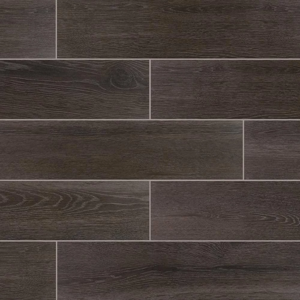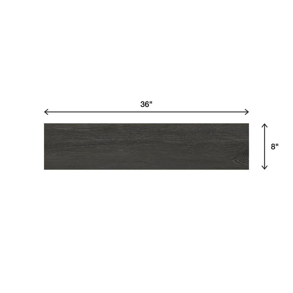 The Kingsborough Midnight 8 in. x 36 in. ceramic tile creates a sleek look. This black wood look tile is versatile and can stand on its own to create a bold design statement or blend in to accent a variety of home decor. Use it in the kitchen bathroom or living room along the floors or up the walls to complete your space.