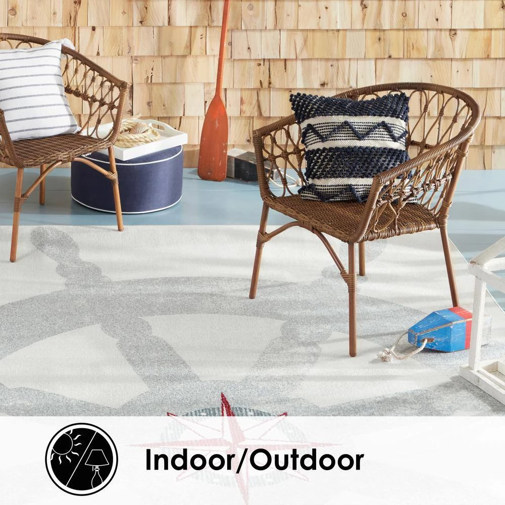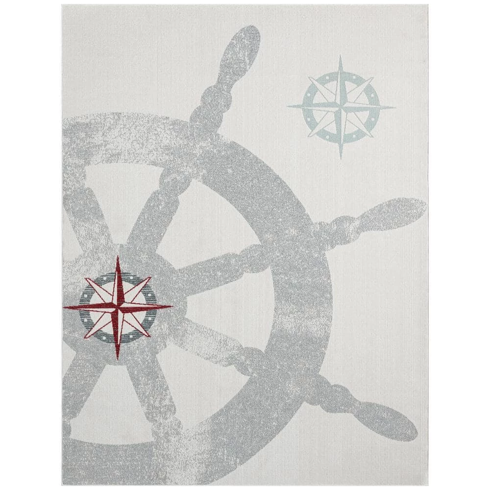 The Marine Helm Area Rug from Home Dynamix brings cool, relaxed, coastal style into your indoor or outdoor space with its large boat helm and navigational star graphics in shades of grey, red, and blue on a cream ground. Machine-woven in a low pile with polypropylene, this indoor/outdoor area rug is stain and fade-resistant and durable enough to handle the elements. The soft pile offers cozy comfort underfoot, and the marine-inspired design brings a calm, welcoming feel into your living space. Made in Turkey.