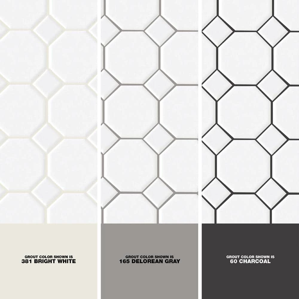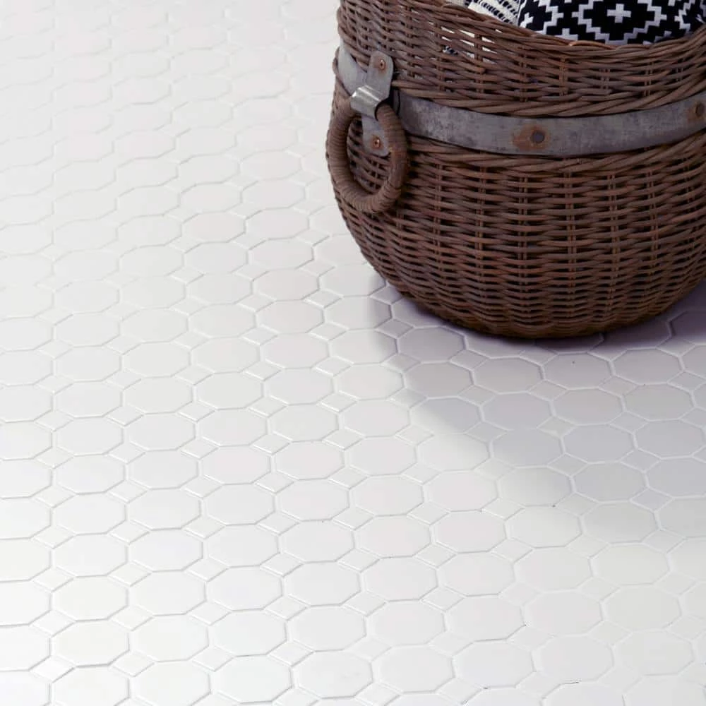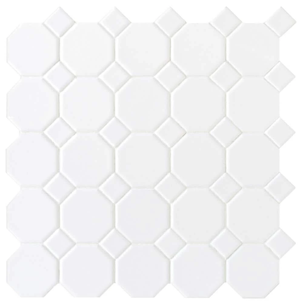 Featuring a classic appearance, the Daltile White 12 in. x 12 in. Ceramic Octagon Dot Mosaic Tile is a great way to beautify your space. This glazed product is made up of octagon-shaped tiles that are accented by smaller tiles. The tile is designed to help withstand high-traffic use in heavy-duty applications and is great for commercial and residential installations. It’s color complements many decors.