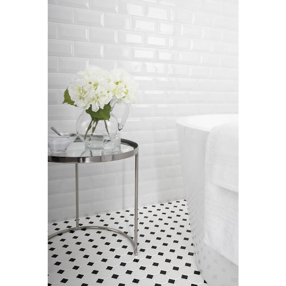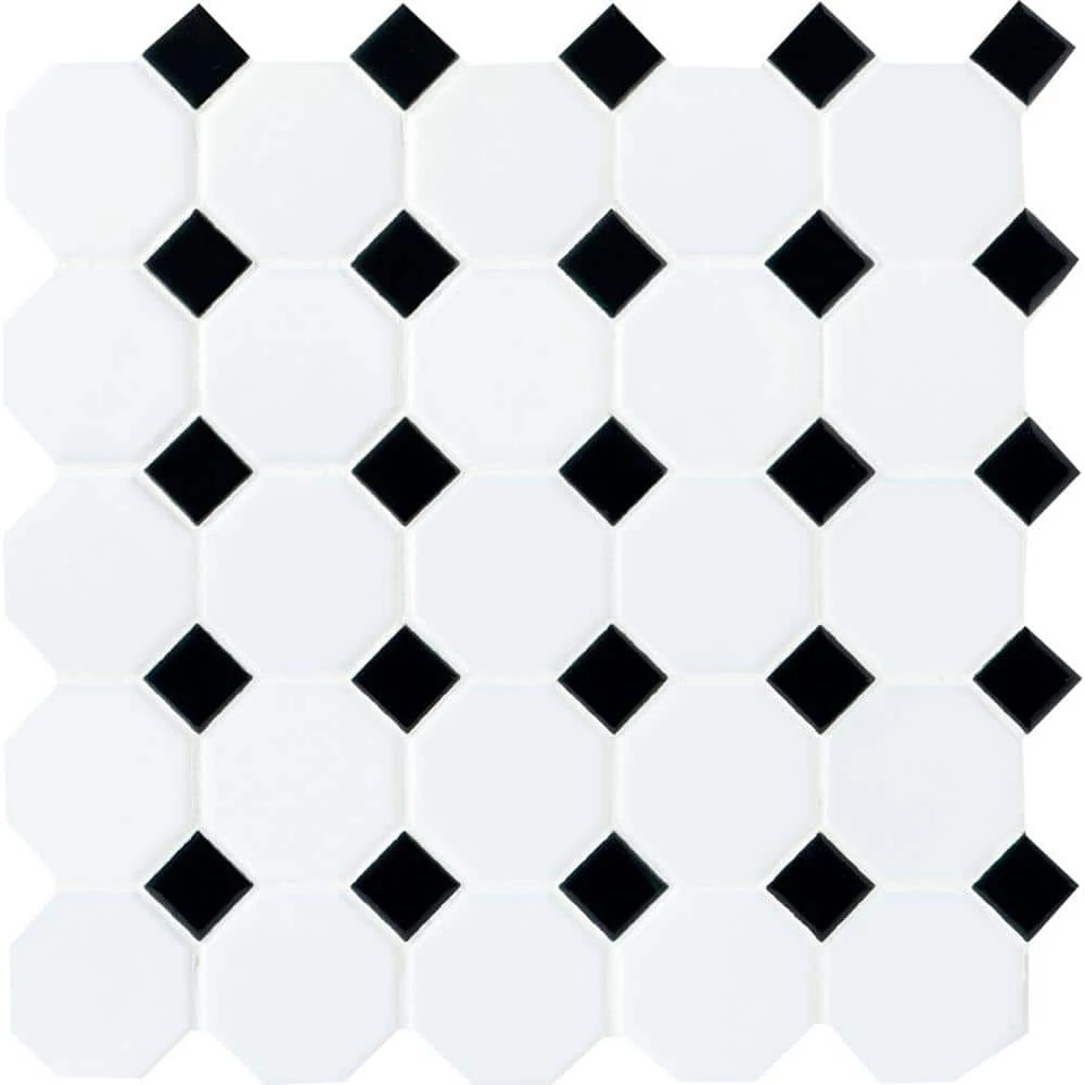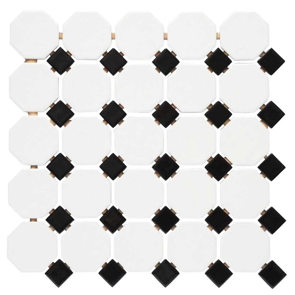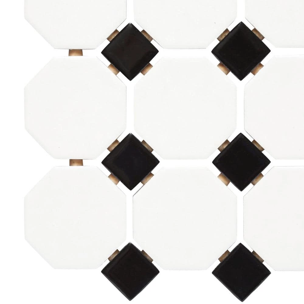 Incorporating a pattern that lends timeless style to any space, the Daltile Matte White with Black Dot Ceramic Mosaic Tile is ideal for remodeling projects, an especially classic choice for bathroom upgrades. This tile features 2 in. x 2 in. white octagons with 1 in. x 1 in. black dots and comes in a pre-formatted sheet to help ensure ease of installation. Suitable for both indoor and outdoor applications, like pool linings, in non-freezing environments.