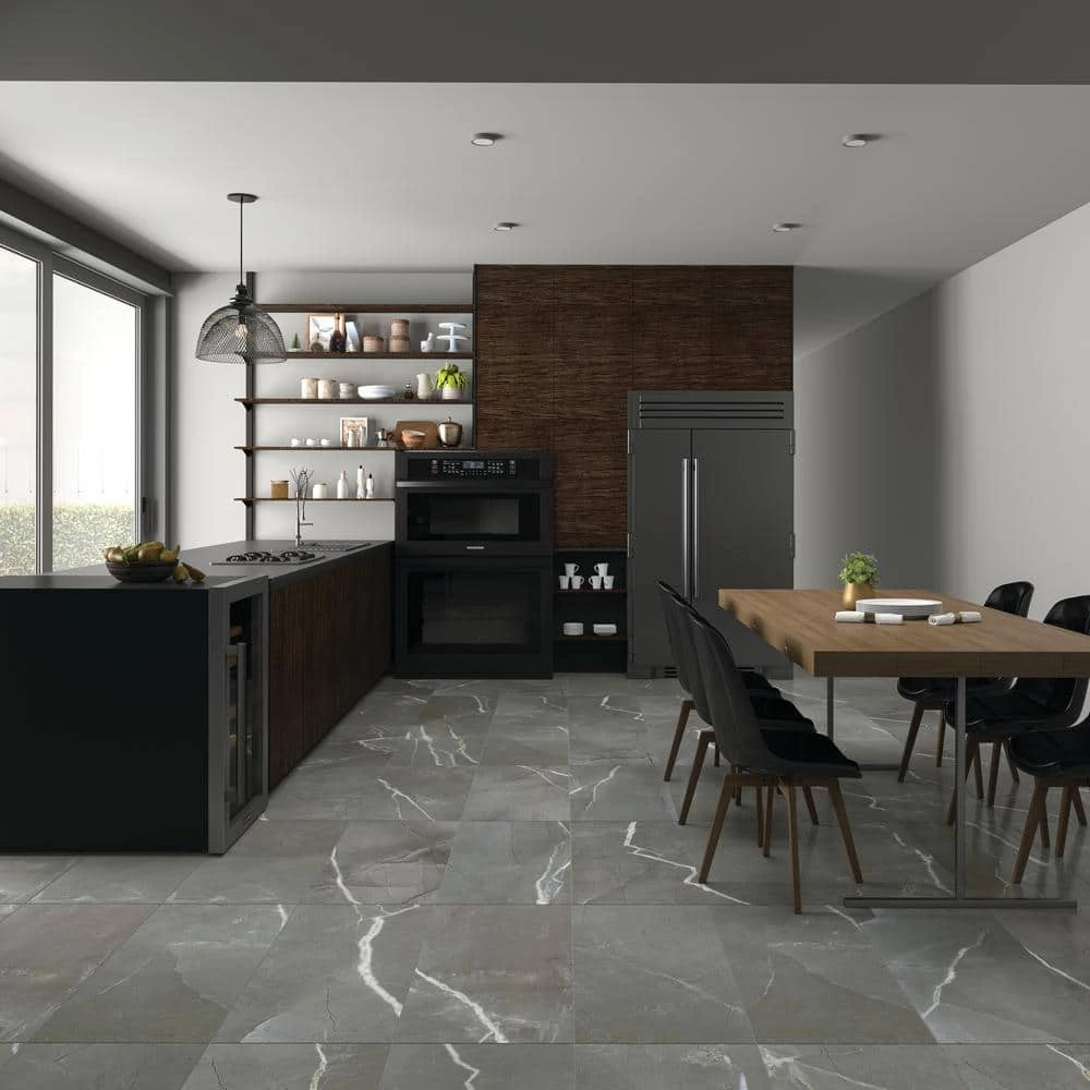 The Rivervale Silver Steel 18 in. x 36 in. ceramic tile is both versatile and durable. This large format tile has an authentic stone look with subtle white veining. Its rich gray tones and simplistic design work together to create the perfect accent piece in any space. Use this product in your kitchen, bathroom, living room or dining room to make a bold statement.